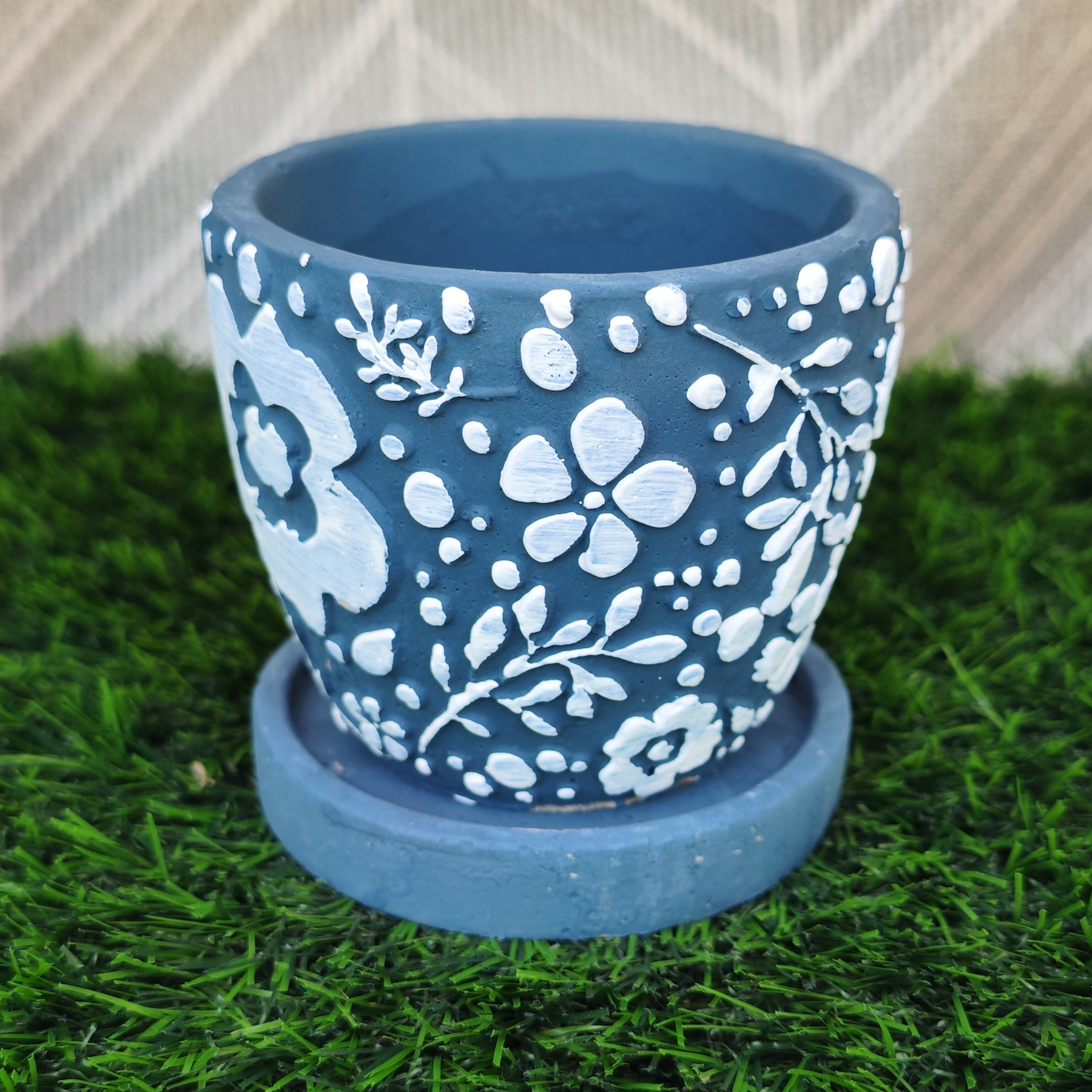 可愛いお花が描かれたおしゃれなセメント鉢です♪
